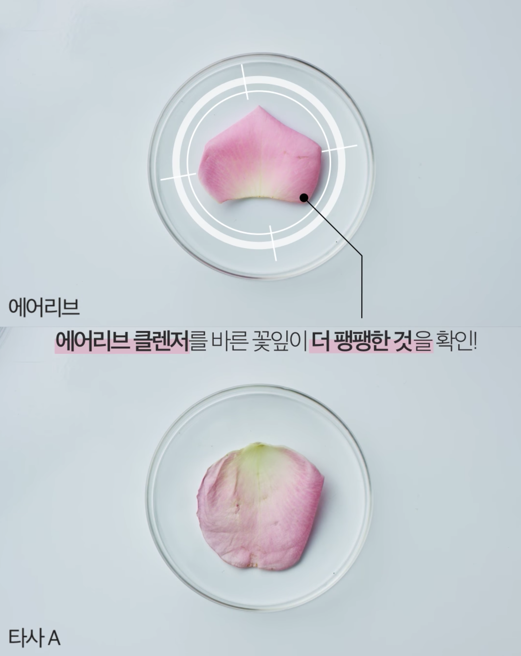에어리브 클렌저를 바른 꽃잎이 더 팽팽한 것을 확인해보세요!